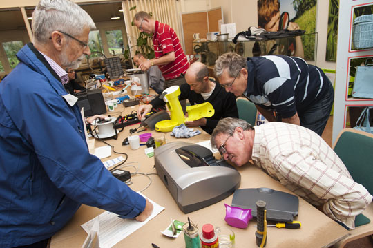 Das Format trifft nicht nur in Offenen Werkstätten, die sich von je her auch dem Erhalt von Dingen verschrieben haben, auf großes Interesse. Bei der Koordinierungsstelle melden sich Kirchengemeinden und Kultureinrichtungen, von der Großveranstaltung bis zum kleinen Café im privaten Wohnzimmer ist alles dabei. Dabei bringen die meisten Initiatoren selbst nur geringe Technikkenntnisse mit. Sie wollen Alternativen zum Wegwerfwahn erproben, viele eint der Wunsch, einen Treffpunkt zu schaffen und ihre Umgebung aktiv mitzugestalten. Und das Konzept schafft, woran ehrgeizige Programme zum Miteinander der Generationen scheitern – bei Repair Cafés kommen ganz selbstverständlich Alt und Jung zusammen. Unter den ehrenamtlichen Fachleuten, ohne die kein Café auskommt, finden sich viele pensionierte Elektrotechniker und andere Handwerker, die ihr Wissen gern mit den BesucherInnen teilen. Menschen aller Altersgruppen treffen hier aufeinander, um gemeinsam nach Fehlern zu suchen, zu reparieren und voneinander zu lernen.