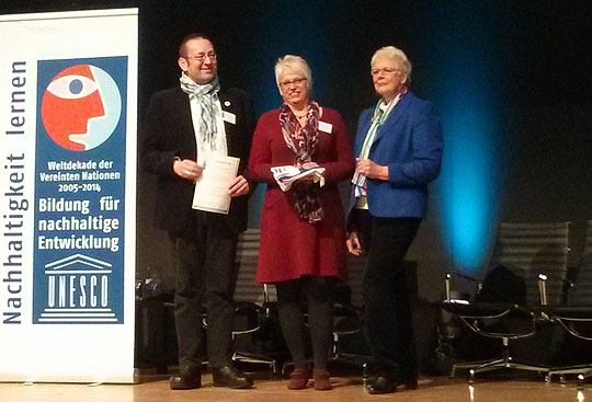 Ausgezeichnet! Stellvertretend für alle Offenen Werkstätten wurde der Verbund als ein Projekt der UN-Dekade 2005-2014 "Bildung für nachhaltige Entwicklung" geehrt. Nein, das bringt kein Geld, aber Ruhm und Ehre in Form einer Urkunde und des schönen Logos, das seit neuestem unsere Webseite ziert. Günter und Marion Schütz aus dem Vorstand haben die Auszeichnung vergangenen Mittwoch bei einer feierlichen Verleihung am Rande der Bildungsmesse didacta in Stuttgart entgegen genommen.